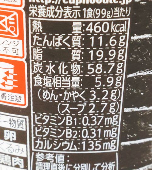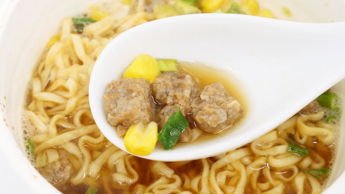 The ingredients are wheat flour, chicken extract, pork extract, soy sauce, pork seasoning, garlic seasoning, beef seasoning, lard, onion seasoning, spices, etc. The toppings are processed minced pork with soy protein, corn, and green onions.