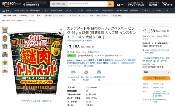 The suggested retail price of 'Cup Noodle Mystery Meat Garlic Pepper Big' is 271 yen excluding tax and will be available at retail stores nationwide from Monday, November 17, 2025. At the time of writing, pre-orders were also available on Amazon.co.jp, and the price was 3,158 yen including tax for a set of 12 (263 yen including tax per piece).