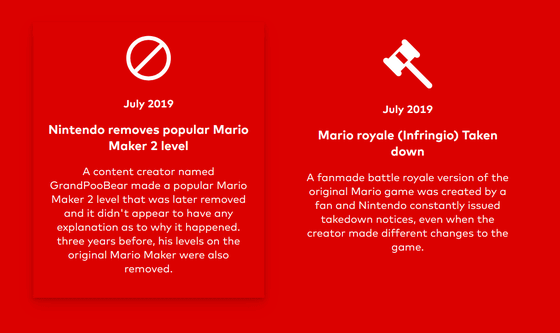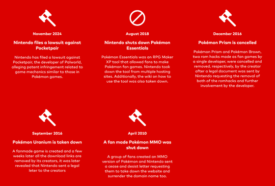 The list includes not only cases that have resulted in lawsuits, but also suspensions of fan-made games and mods for content like Pokémon, Mario, and Zelda, as well as bans for inappropriate behavior in games and tournaments. For example, the July 2019 case shown on the left below, in which