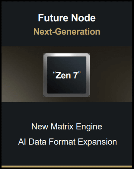 The roadmap also includes the name 'Zen 7.' It is unclear when the Zen 7 generation CPU will be released at the time of writing, but it is indicated that it will be at least after 2026. The roadmap shows that the design is centered around a 'new matrix engine' and 'AI data format extensions.'