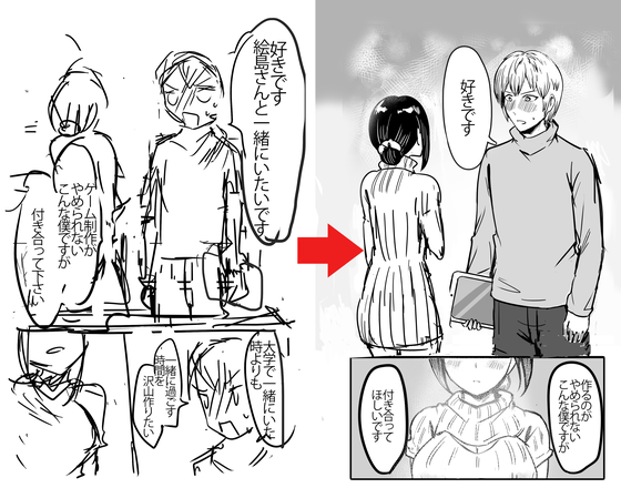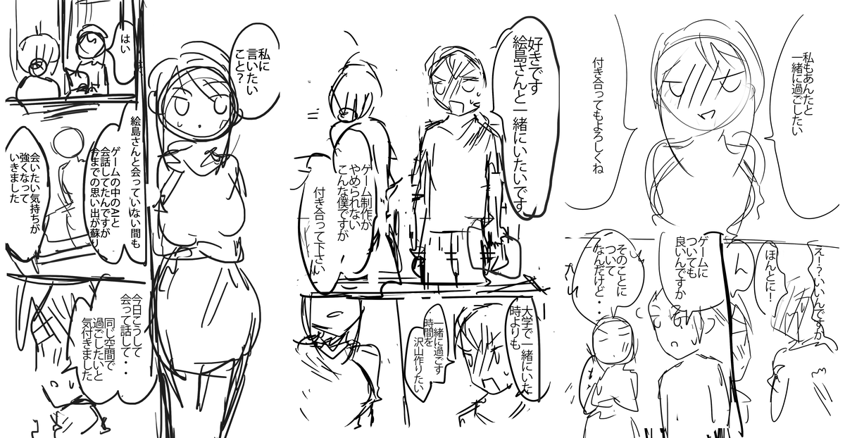 In episode 11, we repeatedly considered creating the atmosphere for the introduction. Below is the initial draft, and the flow of events, where Kaido confesses his feelings to Ejima and she accepts, is the same as in the final manuscript, but the exchanges are simpler.