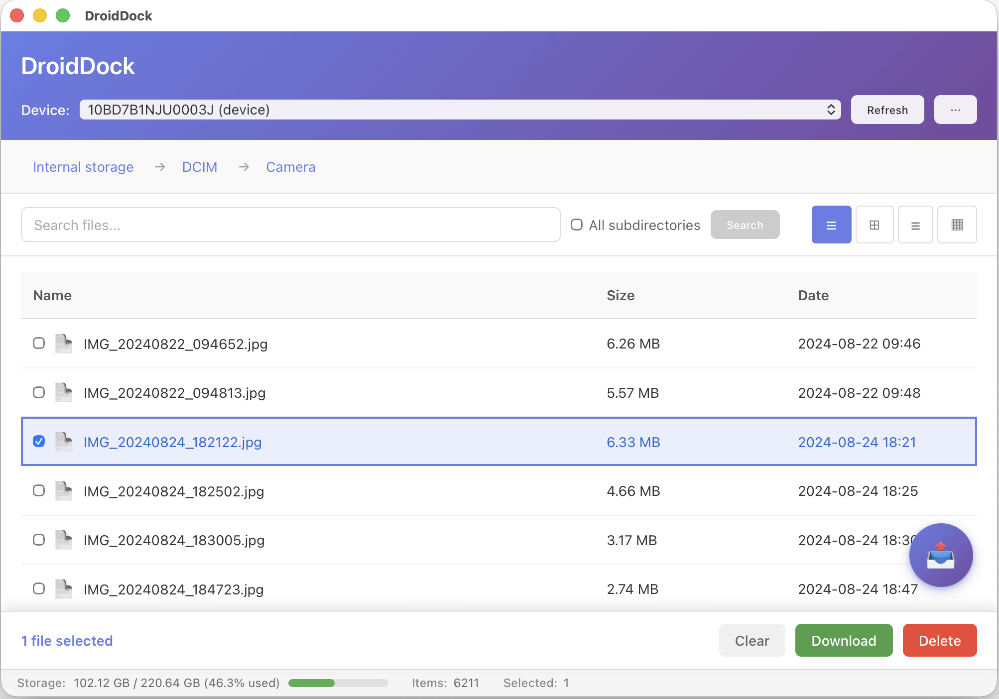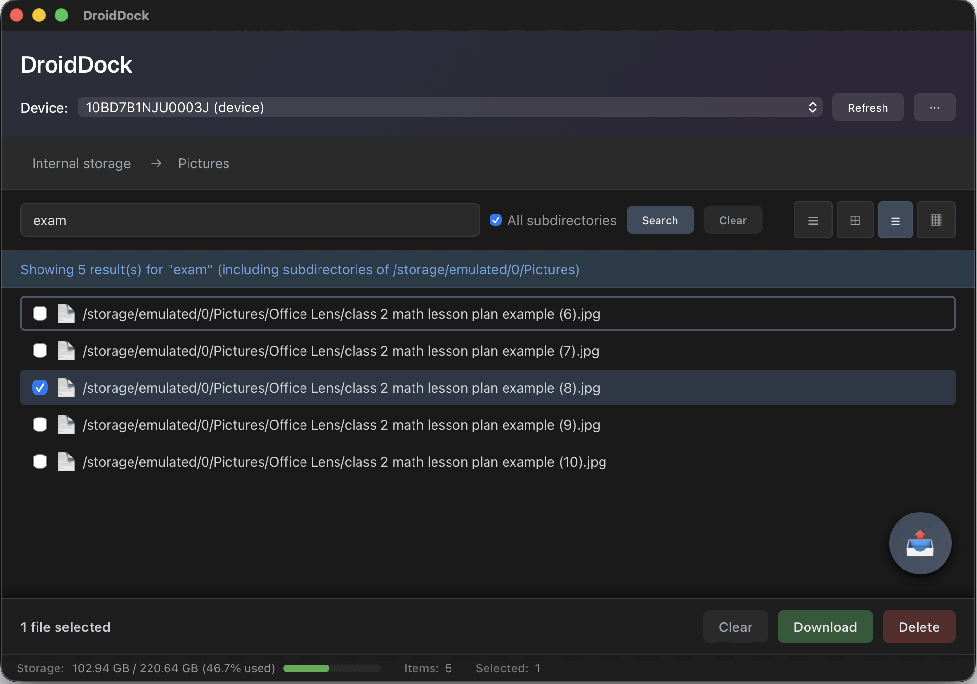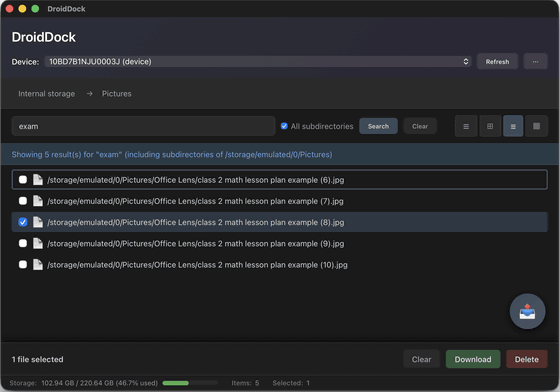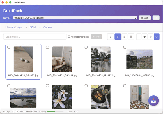 DroidDock automatically detects connected Android devices and lets you browse files on your device through an intuitive interface. Choose from table, grid, list, or column view modes.