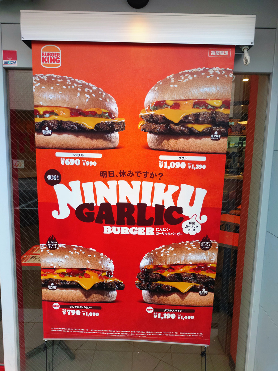 The 'Garlic Garlic Burger' is 690 yen including tax, the 'Double Garlic Garlic Burger' is 1090 yen including tax, the 'Spicy Garlic Garlic Burger' is 790 yen including tax, and the 'Double Spicy Garlic Garlic Burger' is 1190 yen including tax, and is on sale for a limited time.
