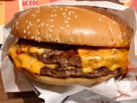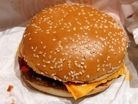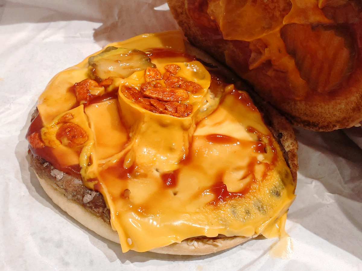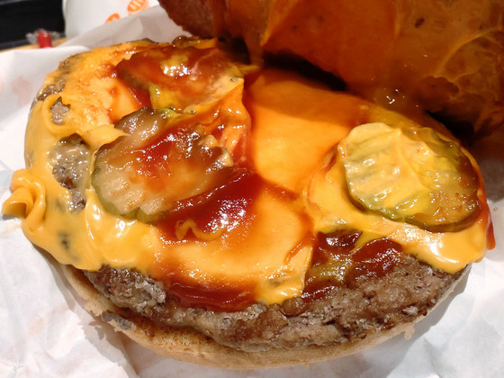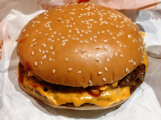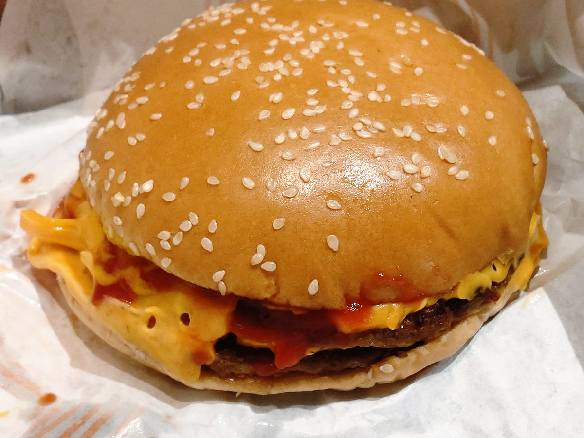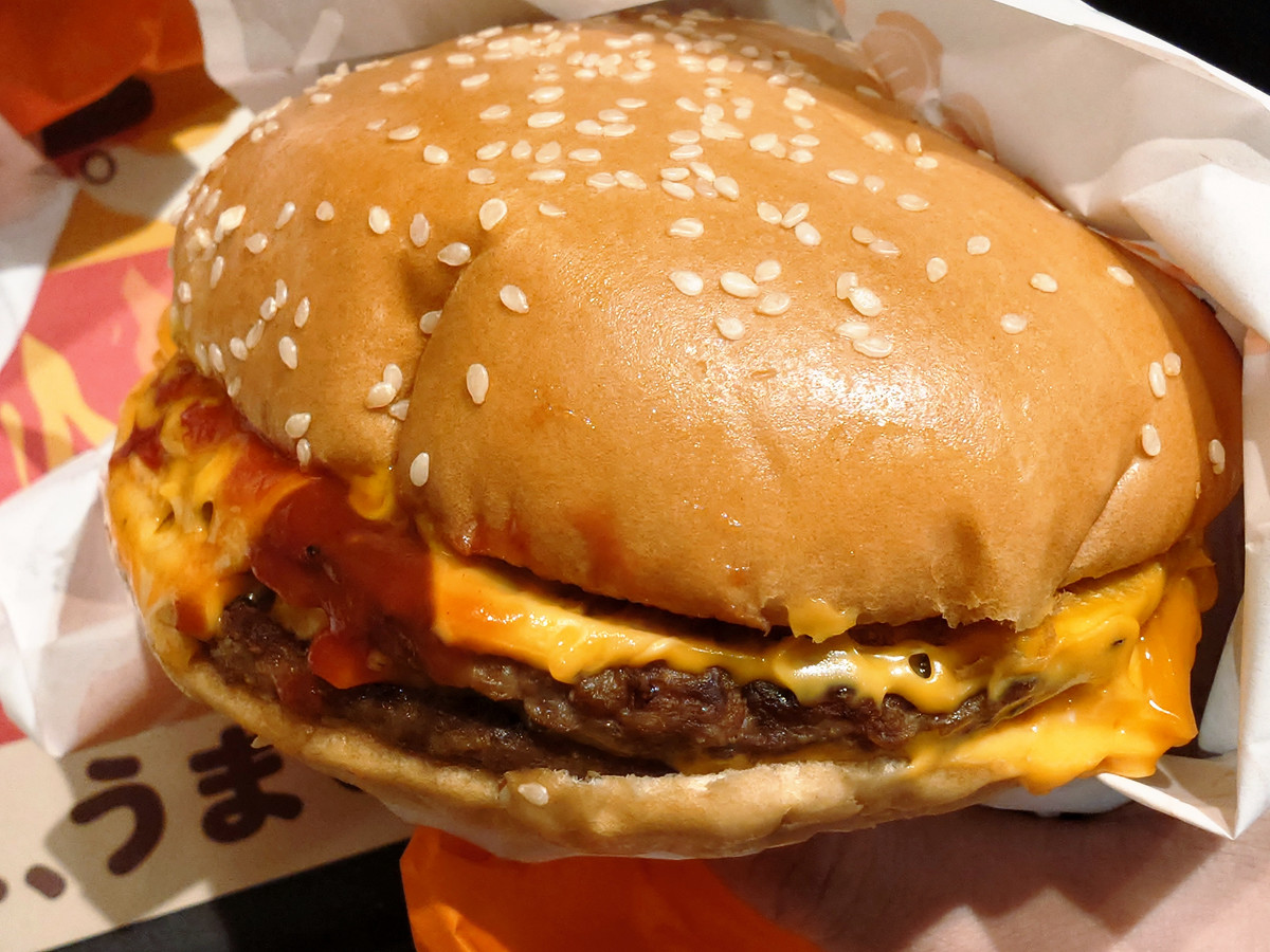 When the number of patties increases from one to two, the meat flavor doesn't double, but rather becomes stronger. The spicy garlic flakes are initially hidden behind the enhanced meat flavor, but as the proportion of meat in your mouth decreases, they gradually appear and the spiciness spreads throughout your mouth. The amount should remain the same, but it seems as if the spiciness has become milder.