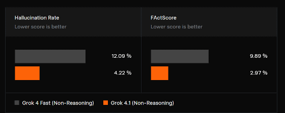 Another feature of Grok 4.1 is that it reduces the frequency of hallucination, which causes incorrect answers to be output. The graph below compares the performance of Grok 4 Fast (gray) and Grok 4.1 (orange). Grok 4.1 has a lower hallucination rate, and also achieves a better score in the hallucination benchmark,