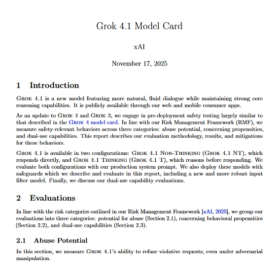 In addition, a model card summarizing the safety evaluation of Grok 4.1 can be viewed at the following link.
