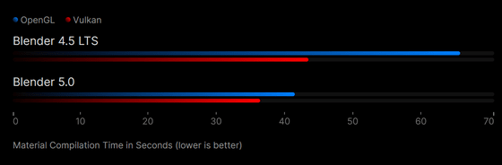 Overall performance improvements include significantly faster material compilation across all backends, improving startup speed and overall usability. Configurations using the NVIDIA and Vulkan backends are up to 4x faster than Blender 4.5 LTS.