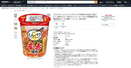 'Maruchan Tonkotsu Paradise Spicy Red Pork Bone' has a suggested retail price of 278 yen excluding tax and will be released on Monday, November 17, 2025. 12 pieces are registered on Amazon, but at the time of writing, they were out of stock.