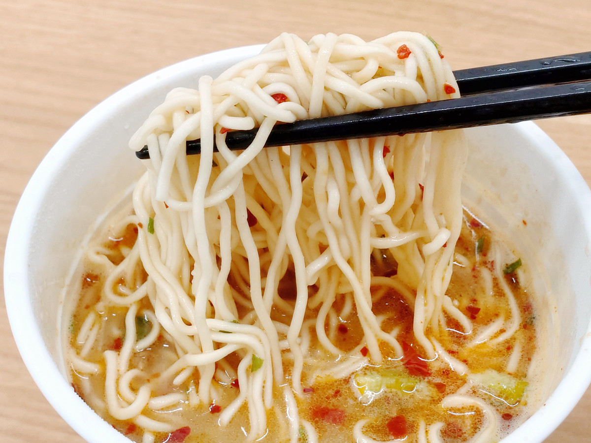 Mix well and it's done. The noodles are not particularly stiff, but they are quite firm and straight. The slightly sweet pork bone soup is complemented by the spiciness of chili oil and chili peppers, making it an easy-to-eat ramen that will have you slurping up the noodles nonstop.