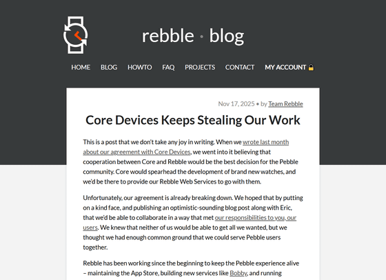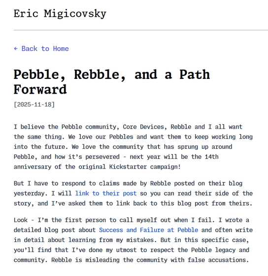 However, in November 2025, Rebble published a blog post stating that 'Core Devices continues to steal Rebble's work,' criticizing Mr. Migikovsky and Core Devices.