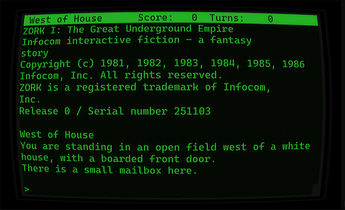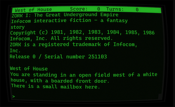 Here's what Zork looks like on the Apple II. Players enter simple English words and phrases like 'north,' 'open trunk,' and 'put the lamp and sword in the case' as commands, and the game progresses accordingly. The program's responses are conversational and sarcastic, reminiscent of a tabletop role-playing game .