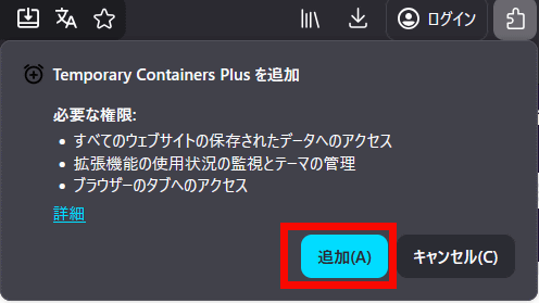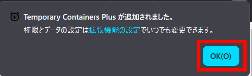 When you see the message 'Temporary Containers Plus has been added,' you're done. Click 'OK' to proceed to the settings.