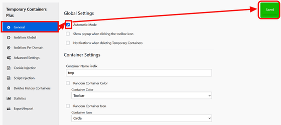 The Temporary Containers Plus menu is shown below. If you check 'Automatic Mode' in the 'General' tab, all newly created tabs will be virtual container tabs. Changes to the settings are automatically saved, and you'll see 'Saved' in the upper right corner.