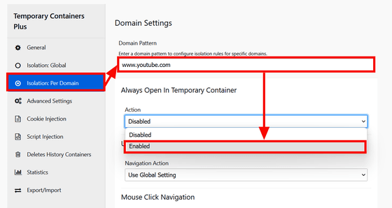 Additionally, in 'Isolation: Per Domain,' you can specify a domain and specify 'This site will always open in a virtual container tab.' After entering the domain, select 'Enabled' in Action.