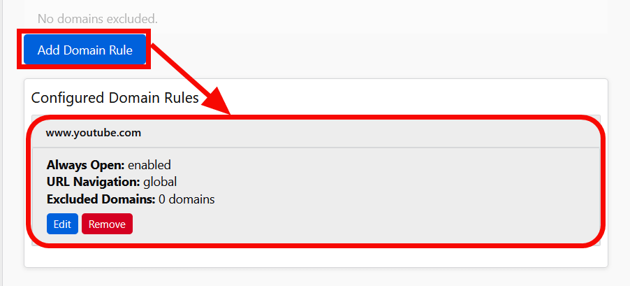 By scrolling down and clicking 'Add Domain Rule,' you can register sites that you want to open in virtual container tabs and sites that you don't want to open in virtual container tabs. In this way, you can use specific sites in private virtual container tabs and sites that require logins or cookies in regular tabs.