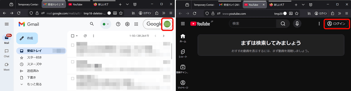 While cookie-free browsing is possible in private windows, Temporary Containers Plus offers the added benefit of allowing you to open multiple virtual container tabs in the same window and use different accounts. Below, we've opened multiple virtual container tabs in the same browser, each with Gmail (left) and YouTube (right). Normally, logging in to Google logs you in to all services, including Gmail and YouTube. However, logging in with a virtual container tab allows you to use different accounts or access specific sites without logging in.