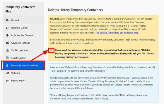 You can also automatically delete the history of sites accessed in virtual container tabs. Under 'Deletes History Containers,' check 'I have read the Warning and understand the implications that come with using 'Deletes History Temporary Containers.' When ticking the checkbox, Firefox will ask you for 'Access browsing history' permissions.'