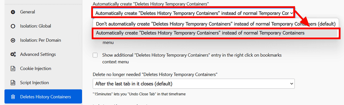 Next, select 'Automatically create 'Deletes History Temporary Containers' instead of normal Temporary Containers' from the drop-down menu.