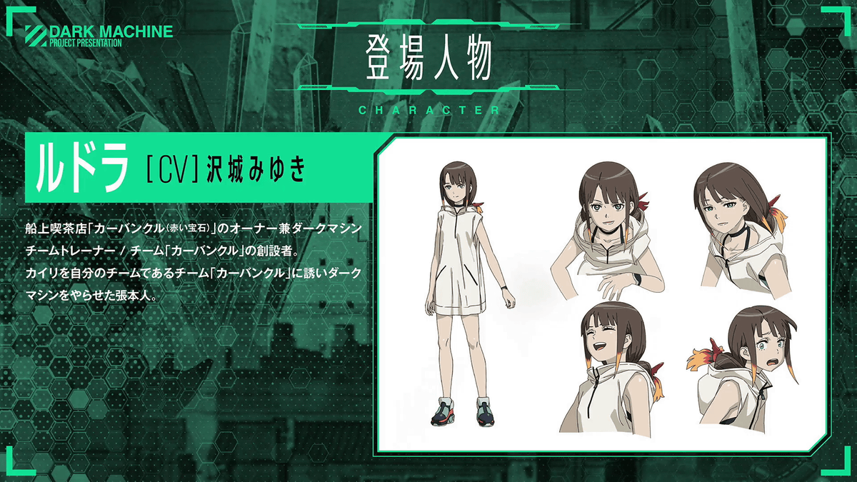 The role of Rudra, the owner of the ship's coffee shop 'Carbuncle' and the founder of the dark machine team 'Carbuncle,' is played by Miyuki Sawashiro. Kairi's encounter with Rudra leads her to become involved with the dark machines.