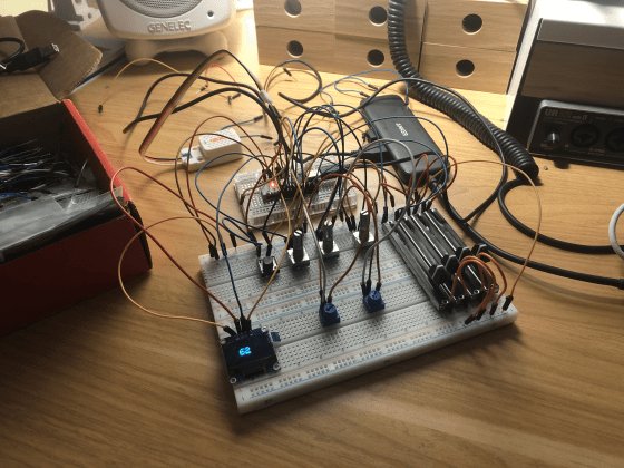 The next step was to transfer the audio synthesis circuitry from Logic to the breadboard. Being able to use a pre-made synthesizer module significantly reduced the development time. He also added an OLED display to provide visual feedback and display characters that his daughter would enjoy. However, the RAM capacity was too small to buffer full-frame video, and despite updating the screen in small patches, he was unable to solve the lag problem during fast-paced performances.