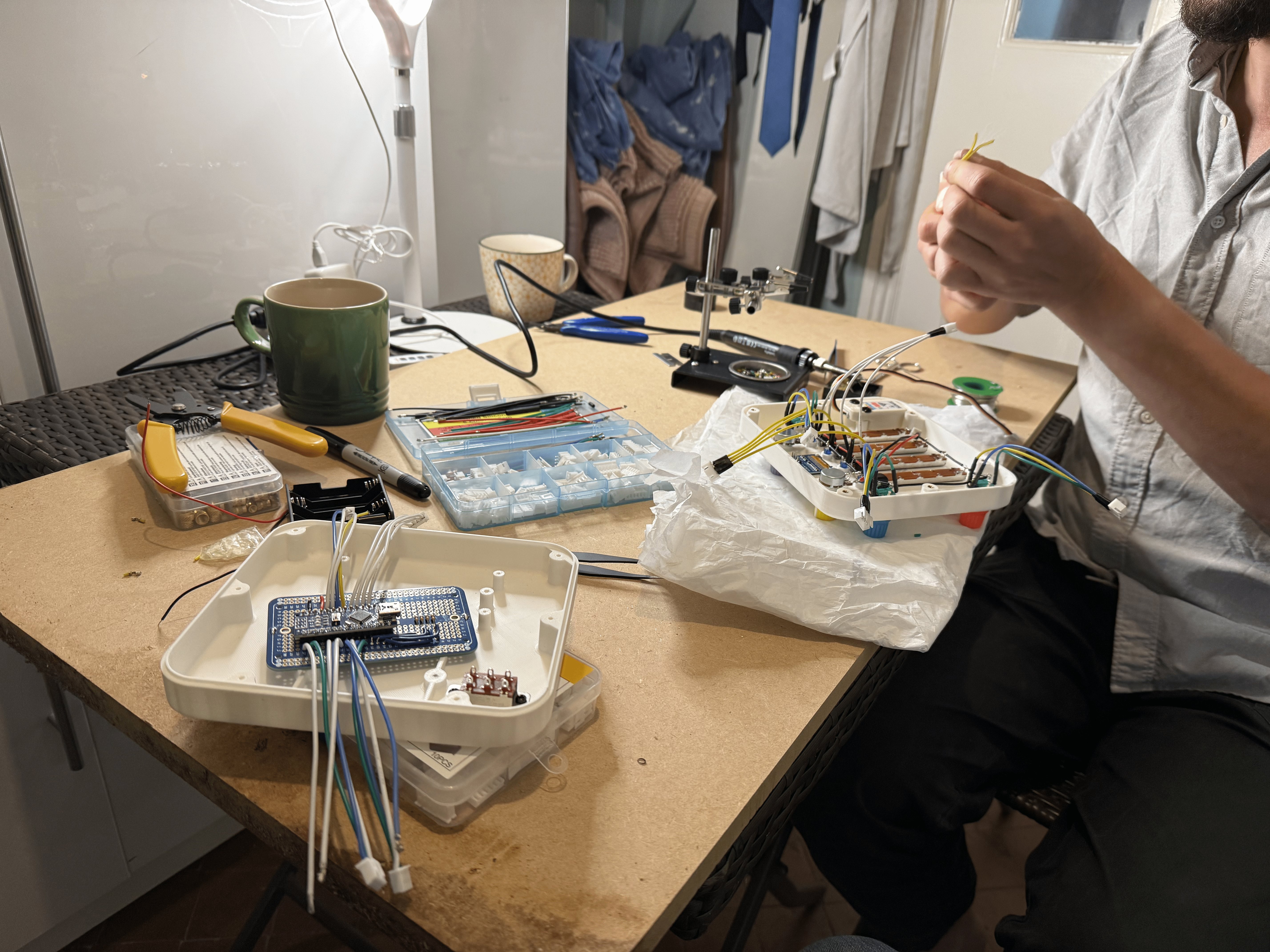 Once the case was complete, they first soldered the wiring to a breadboard and then assembled it into the case. They had some trouble with the soldered parts breaking when they tried to close the case because they had packed in too many wires, but Roberts was satisfied when he showed his daughter how much fun she had had with it.