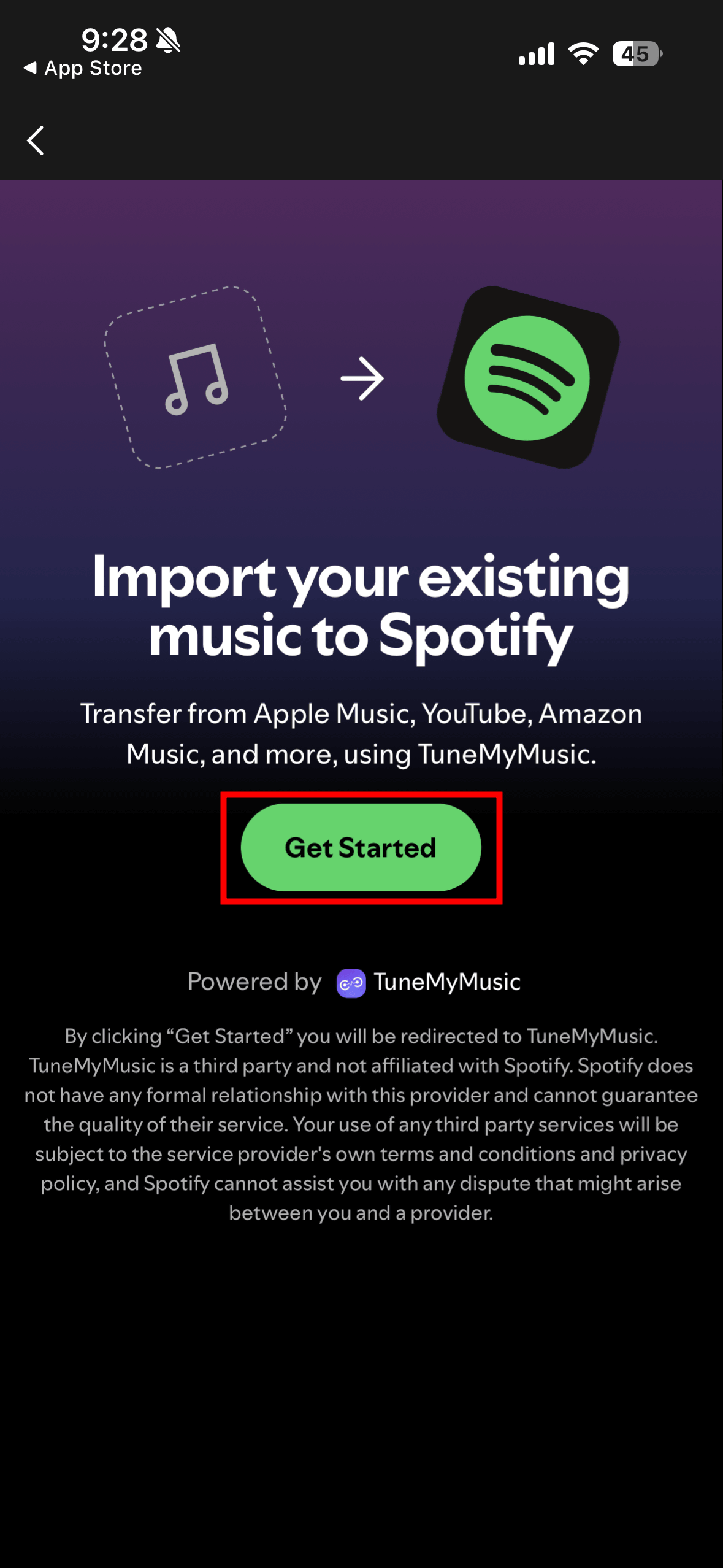Tap 'Get Started' to open the TuneMyMusic website.