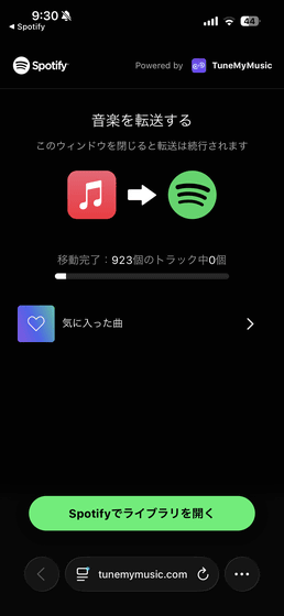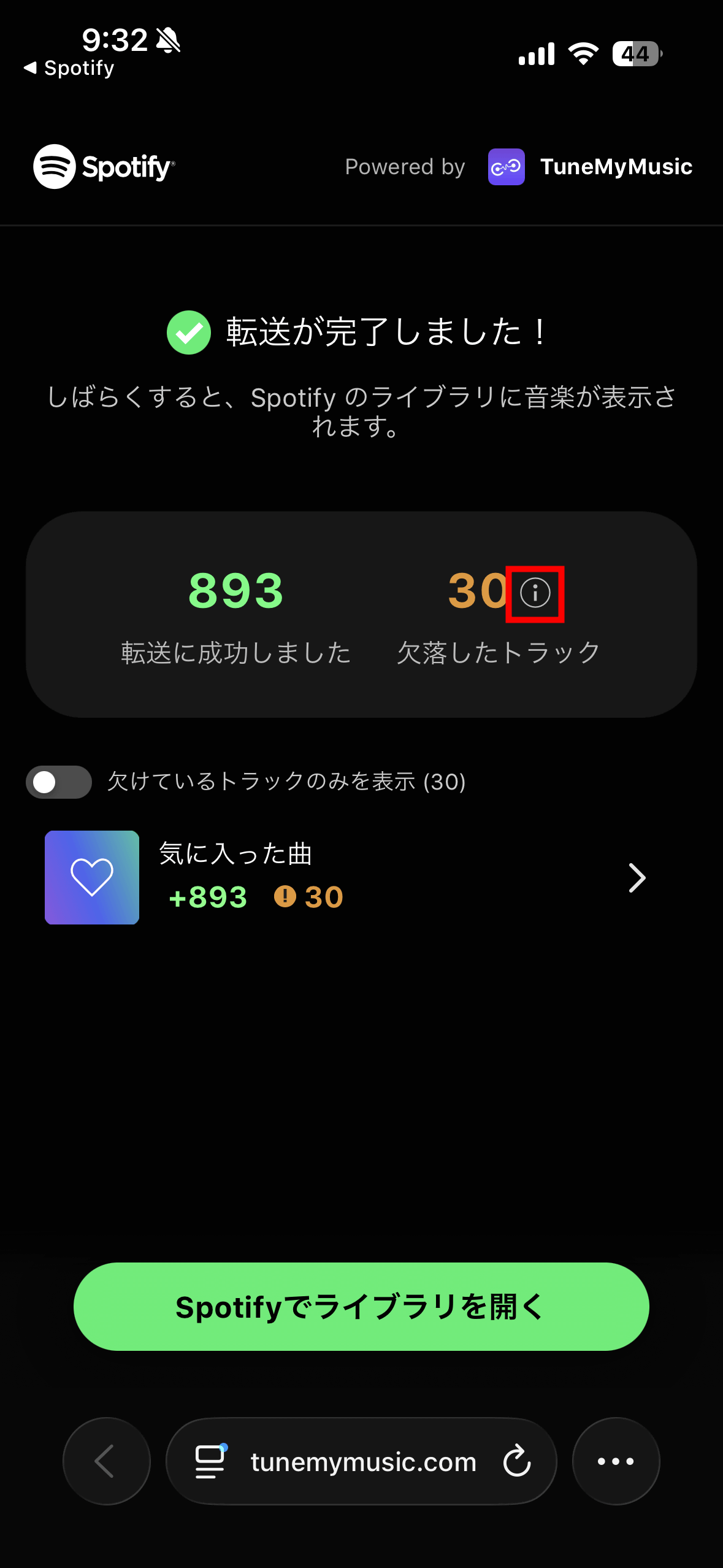 Of the 923 songs in the transferred playlist, 30 were missing. Tap 'Open Library in Spotify.'