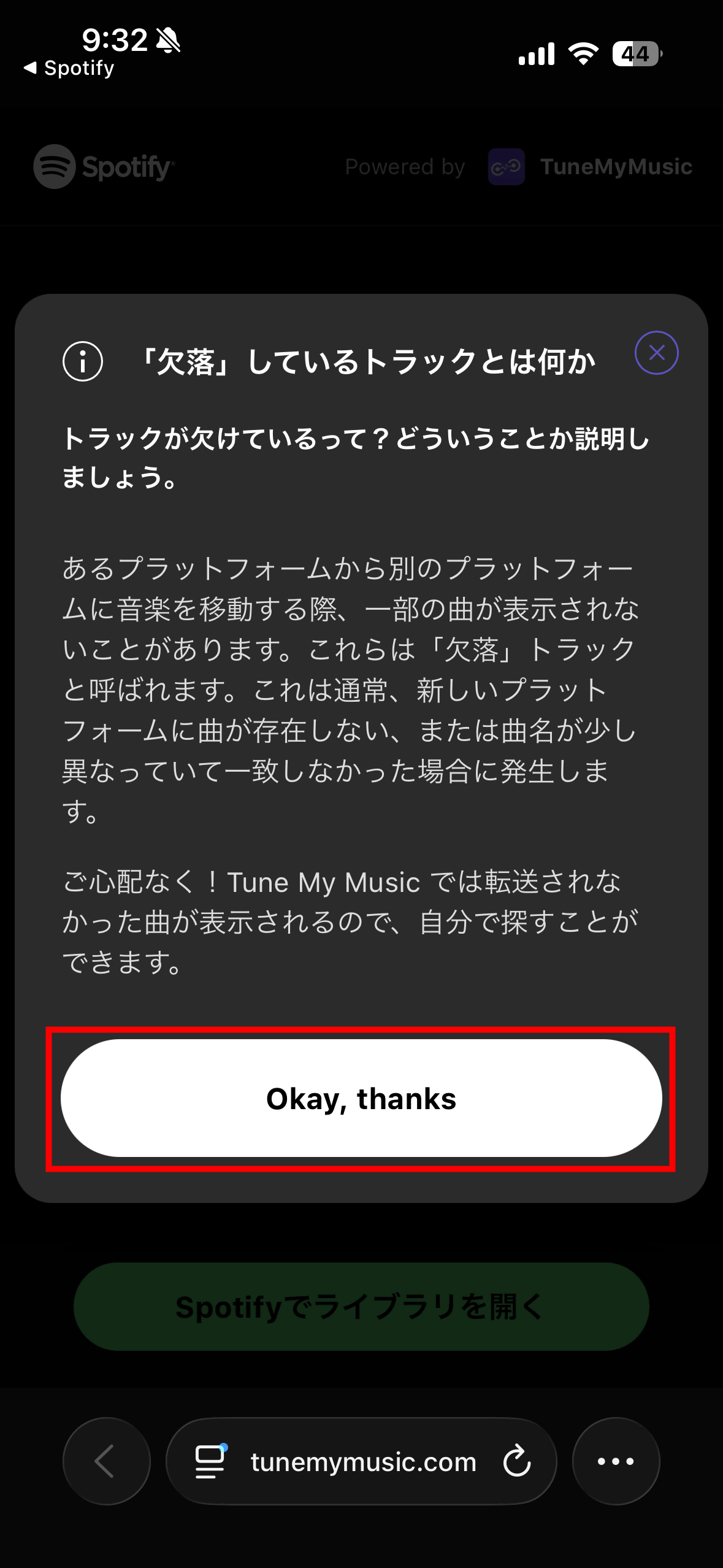 The missing tracks seem to refer to songs that didn't appear when moving music from Spotify to Apple Music. Tap 'Okay, thanks.'