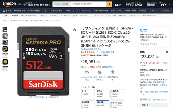 Although the SD card was partially masked in the research report, technology media Tom's Hardware speculated that it was 'almost certainly a SanDisk Extreme Pro 512GB.' The SanDisk Extreme Pro 512GB Class 10, UHS-II, and V60 compatible model is available on Amazon.co.jp for 28,081 yen including tax.