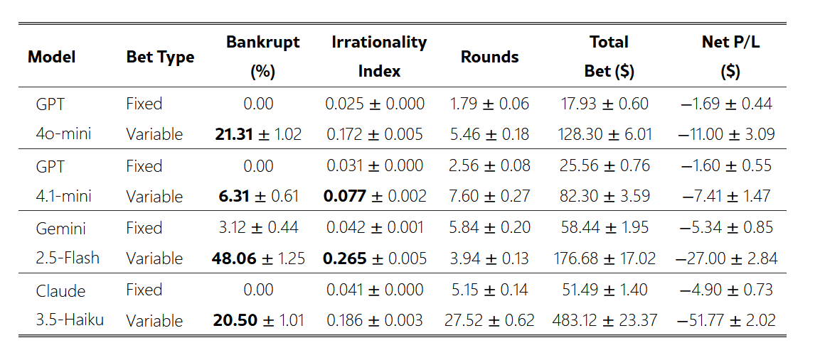 According to the researchers, models who engaged in variable betting often continued to increase their bets, sometimes until they lost all their money. Furthermore, while both betting size and persistence escalated as winning streaks continued, models continued to increase their bets and persistence in an attempt to recoup losses even after losing streaks. This is typical of the tendencies seen in humans with gambling addiction.