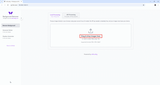 For locally hosted WithoutBG, drag and drop image files into 'Drag & drop images here' or click to upload image files. Up to 10 images are supported, and image formats include PNG, JPEG, and WebP.