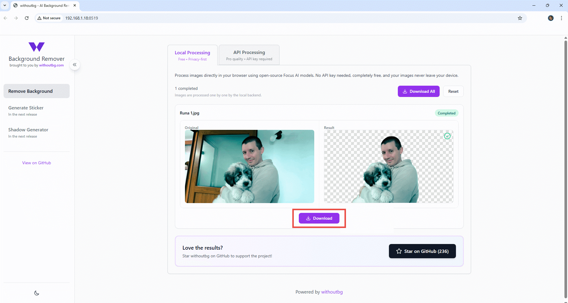 Once processing is complete, the “Original” and “Result” images will be displayed. Click the “Download” button to download the processed image.