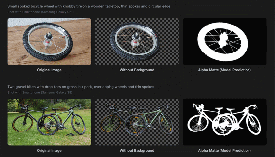 Now, let's look at an example of an image where the background has been removed using WithoutBG. First, we have an image of a bicycle that has been processed. The original image, the image with the background removed using WithoutBG, and the alpha channel are displayed side by side. You can see that the body and wheel, as well as the thin spokes, have been beautifully extracted.