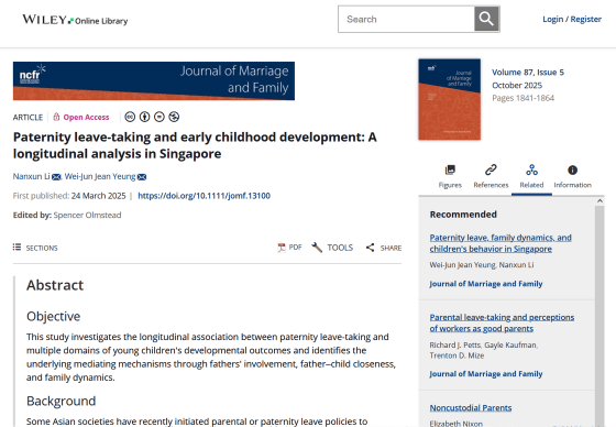The analysis showed that fathers taking two weeks or more of parental leave was associated with improved letter and word identification scores in children aged 3 to 6 and 5 to 8. A positive correlation was also confirmed between fathers taking two weeks or more of parental leave and improved scores in children aged 3 to 6 on applied questions measuring numerical thinking ability. It was also reported that fathers taking one week of parental leave was associated with improved scores in children aged 5 to 8 on applied questions. These results indicate that fathers taking parental leave is associated with the development of children's language and numerical thinking skills.