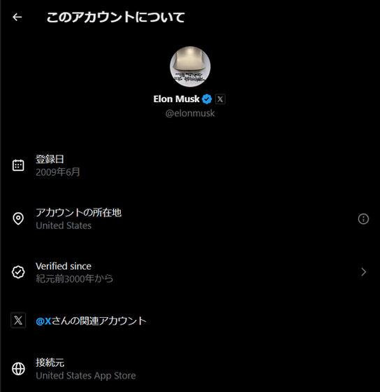 The following information will be displayed: X's registration date, account location, when it was a verified account, related accounts, and connection source. X's owner, Elon Musk, appears to have had a verified account since 3000 BC.