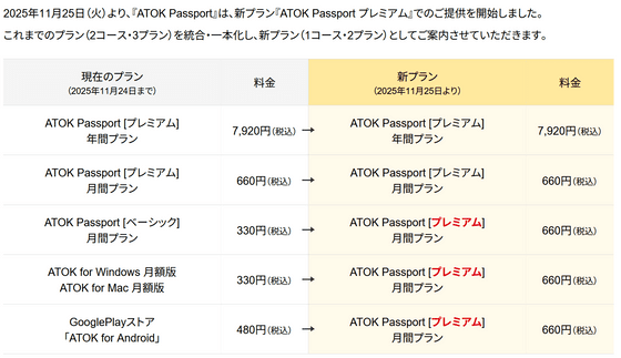 Starting November 25, 2025, the 'ATOK Passport' plans will be consolidated into 'ATOK Passport [Premium]' and will be offered in two plans: 660 yen per month or 7,920 yen per year (660 yen x 12 months).