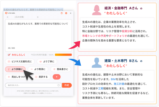 ' ATOK MiRA (My Intelligent Rewrite Assistant) ' is a writing assistant that combines ATOK's Japanese language processing technology with a generation AI that matches the user's input habits and settings to suggest sentences tailored to the user. Users can seamlessly interact with the generation AI as an extension of their input operations, and simply select standard commands such as 'business style' or 'more detail,' and the AI can revise and summarize text, generate ideas, and even rewrite sentences. It is scheduled to be available for ATOK for Windows in February 2026, and for other operating systems from June 2026 onwards.