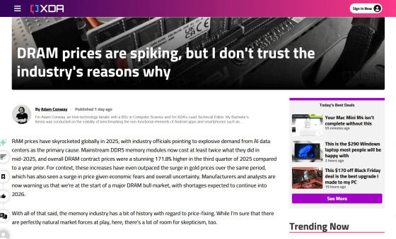 DRAM , a type of volatile memory widely used in PCs, smartphones, data centers, and more, is experiencing a historic price surge in 2025. DRAM manufacturers blame the price hike on increased demand for AI, but Adam Conway, a writer for technology media and XDA Developers, is skeptical of this explanation.
