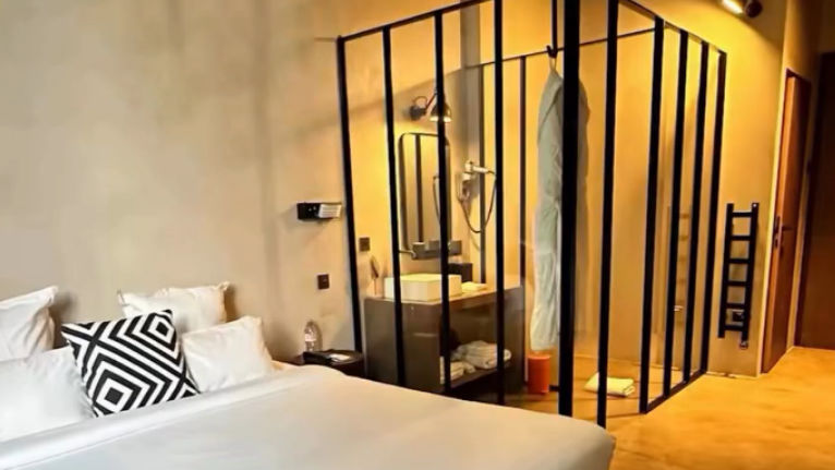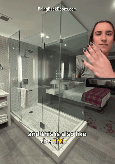 They also feature bathrooms that have doors but don't offer privacy. The bathroom in this four-star luxury hotel in Washington is completely covered in glass, making it completely visible from the bedroom. According to Bring Back Doors, bathrooms with glass doors like this are a common design seen in luxury hotels in Europe and the United States.