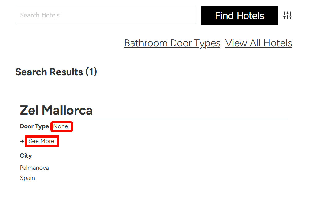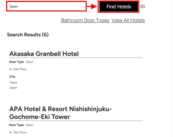 You can check the door information. The hotel you searched for this time will show the door type as 'None,' which means the bathroom may not have a door. Clicking 'See More' will display the search results for that hotel on Booking.com, a hotel reservation site, so you can view more detailed hotel information.
