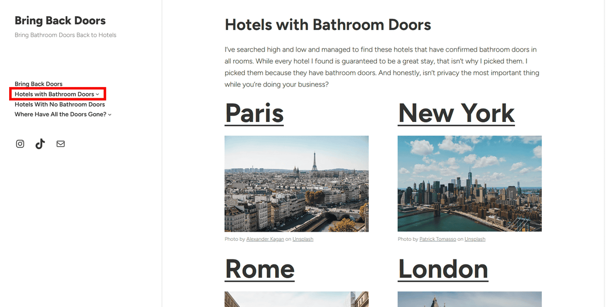 Click on 'Hotels with Bathroom Doors' on the left to see a list of hotels with bathroom doors in all rooms surveyed by Bring Back Doors, including hotels in Paris, New York, Rome, London, Los Angeles, Dubai, Lisbon, Amsterdam, and Barcelona.