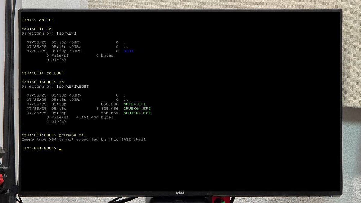 However, since the environment was using a 64-bit CPU limited by a 32-bit UEFI boot loader, the installation of the 64-bit version of Debian failed.