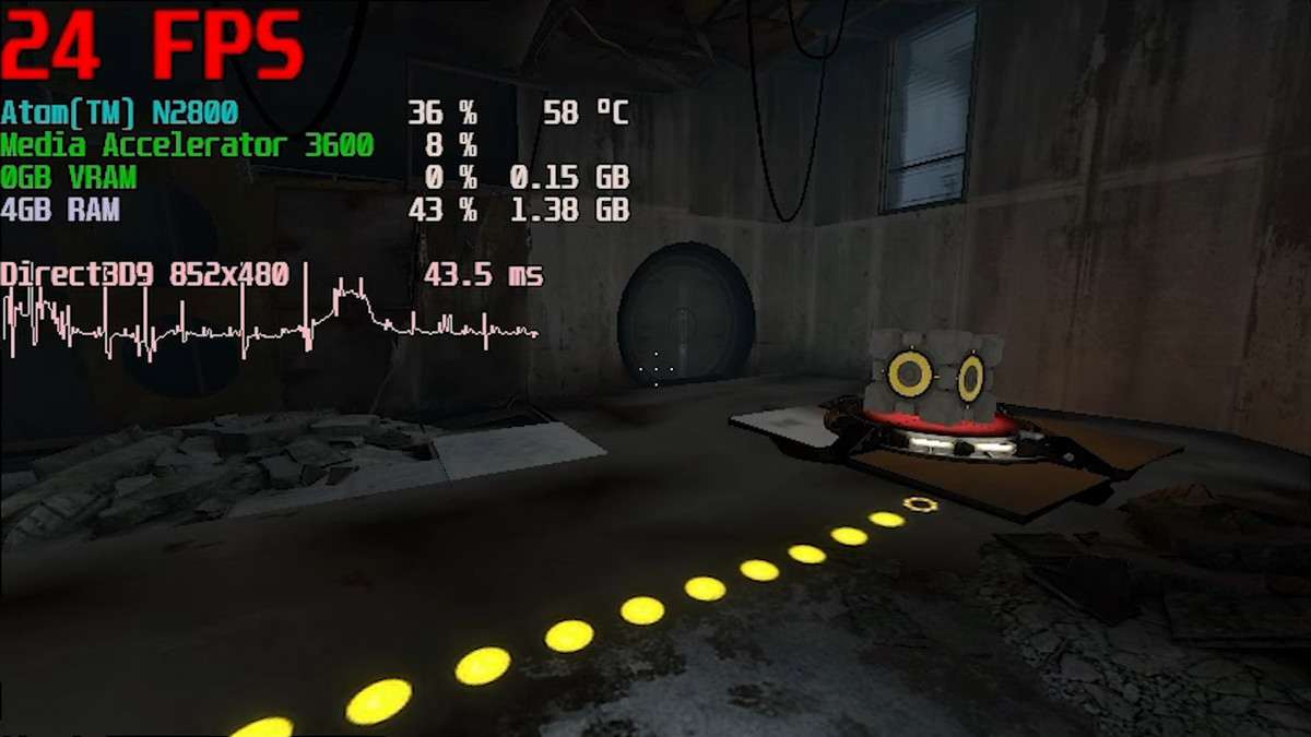 Portal can now be played at a maximum of 30 FPS at a lower resolution of 852x480, but it quickly drops to a few FPS and becomes quite choppy.