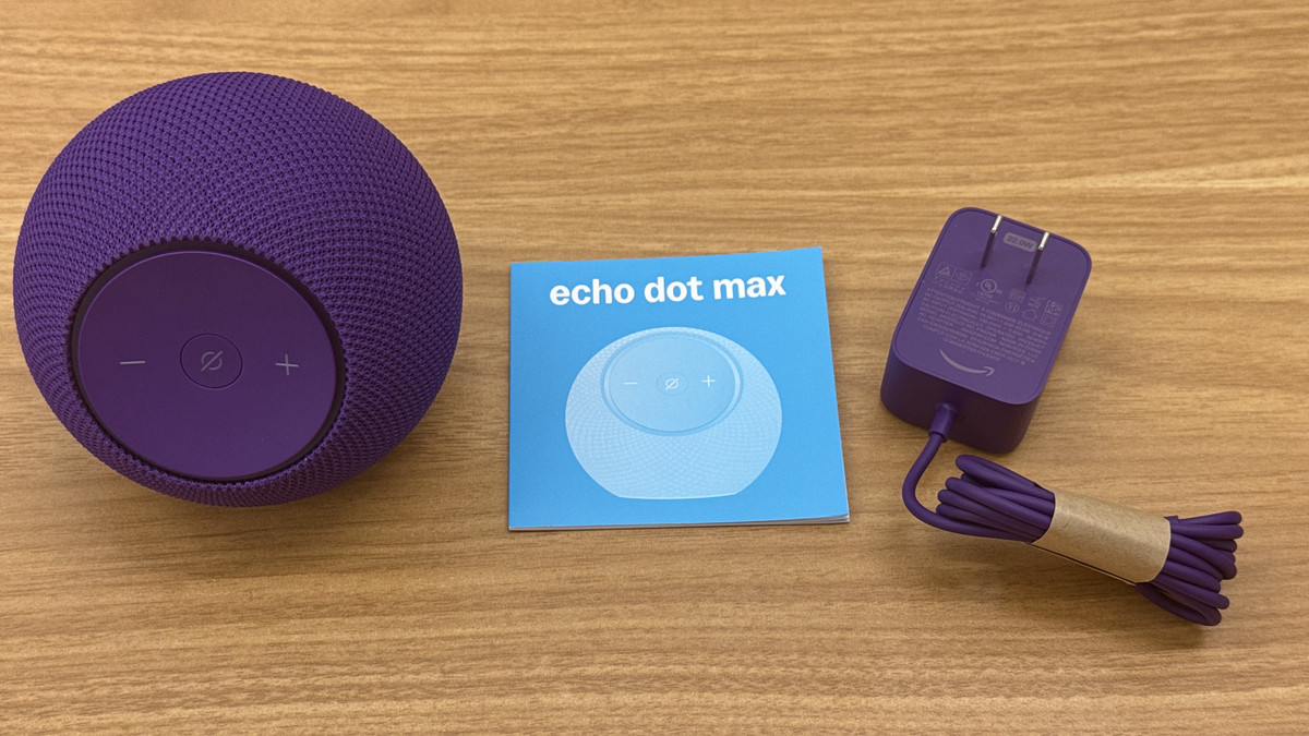The contents include the Echo Dot Max itself, an instruction manual, and a power cable. The Echo Dot Max comes in three colors: amethyst, graphite, and glacier white. The one I borrowed this time was amethyst.