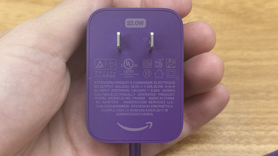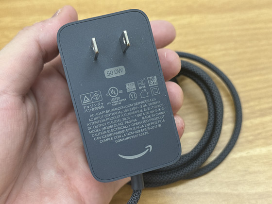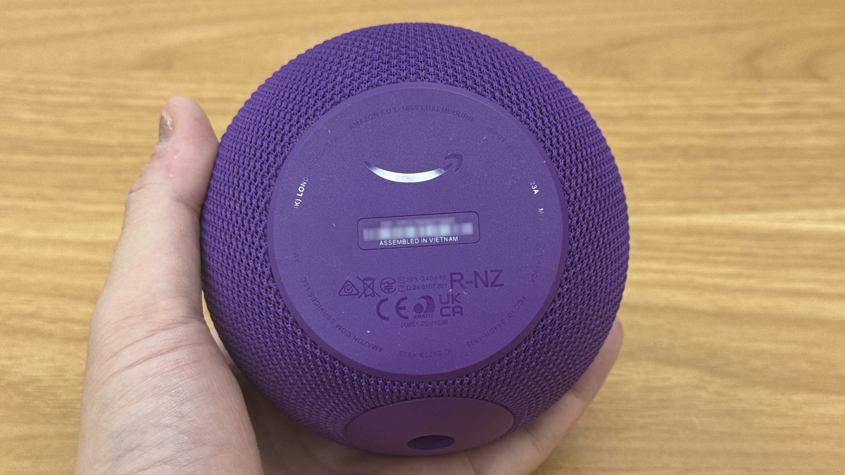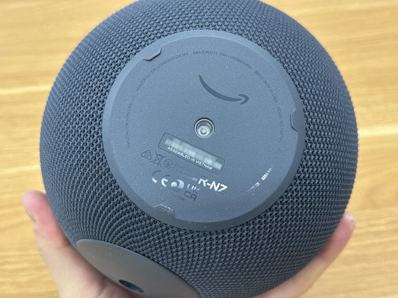 The bottom is made of rubber and has a non-slip surface, and is marked with the Amazon logo, serial number, and technical conformity mark.
