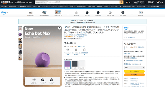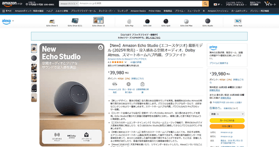 Echo Dot Max and Echo Studio can be purchased from Amazon.co.jp below. The price for Echo Dot Max is 14,980 yen including tax, and the price for Echo Studio is 39,980 yen including tax.