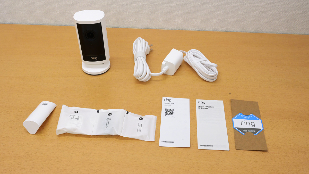 I took out all the contents. From the top left, there is the Ring Outdoor Cam Pro, the power adapter, the mounting parts, the mounting screws, the instruction manual, and the stickers.