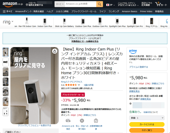 The Ring Outdoor Cam Pro is available on Amazon.co.jp for 33,980 yen (tax included). The Ring Indoor Cam Plus is also eligible for the Black Friday sale and can be purchased for 5,980 yen (tax included) during the sale period.