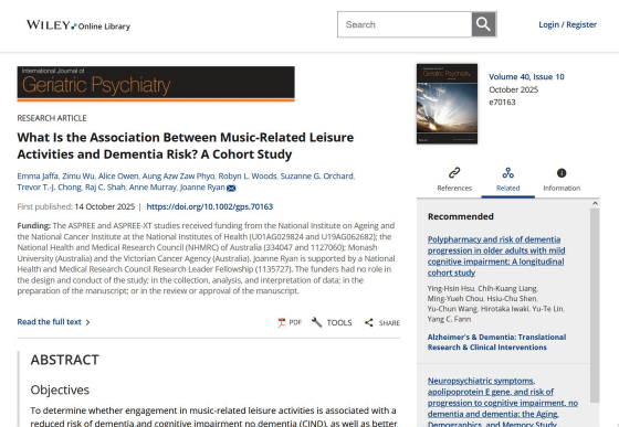 A research team led by Emma Jaffa and Professor Joanne Ryan, who study public health at Monash University in Australia, analyzed data from a longitudinal study of older adults living in Australia to examine the effects of listening to music or playing an instrument on cognitive function in older adults.