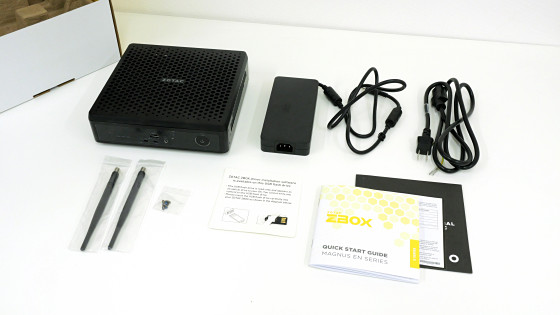 Inside the box were the MAGNUS EN275060TC, a power adapter, a power cord, antennas for improving Wi-Fi and Bluetooth signal reception, screws for securing the mounting parts, a USB memory stick with various drivers, an instruction manual, a warranty card, etc. The retail version also comes with mounting parts for attaching it to the back of a display.